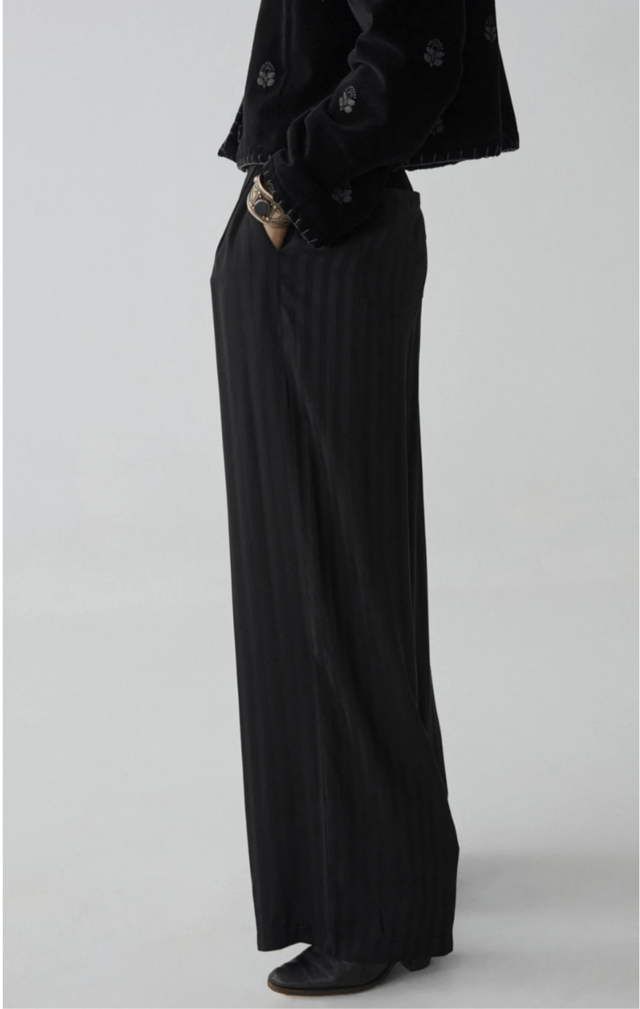 These trousers, with their deep, rich drape move effortlessly, creating a powerful yet understated silhouette. The design features a sharp, tailored waistline that transitions into relaxed, wide legs, striking a balance between precision and ease. The subtle vertical lines add a touch of sophistication, making these pants a staple for those who appreciate elegance with an edge.