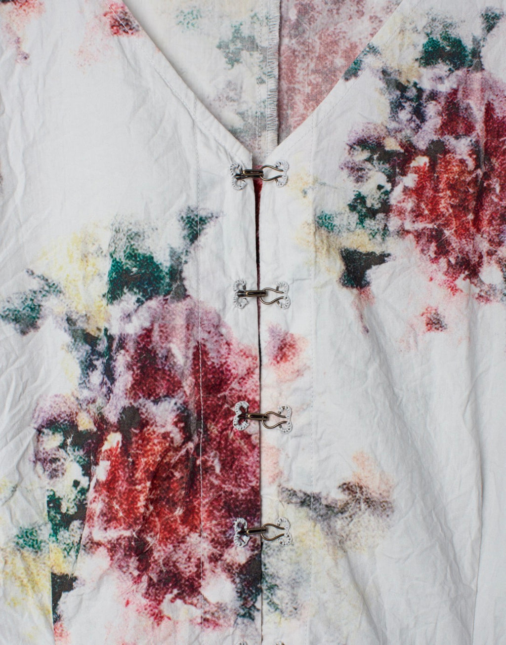 Beautiful flower printed dress Sonja in crispy cotton.Pockets on sides.Hook and eye fastenings on front.Vintage feel wooden buttons on back.100% cotton.